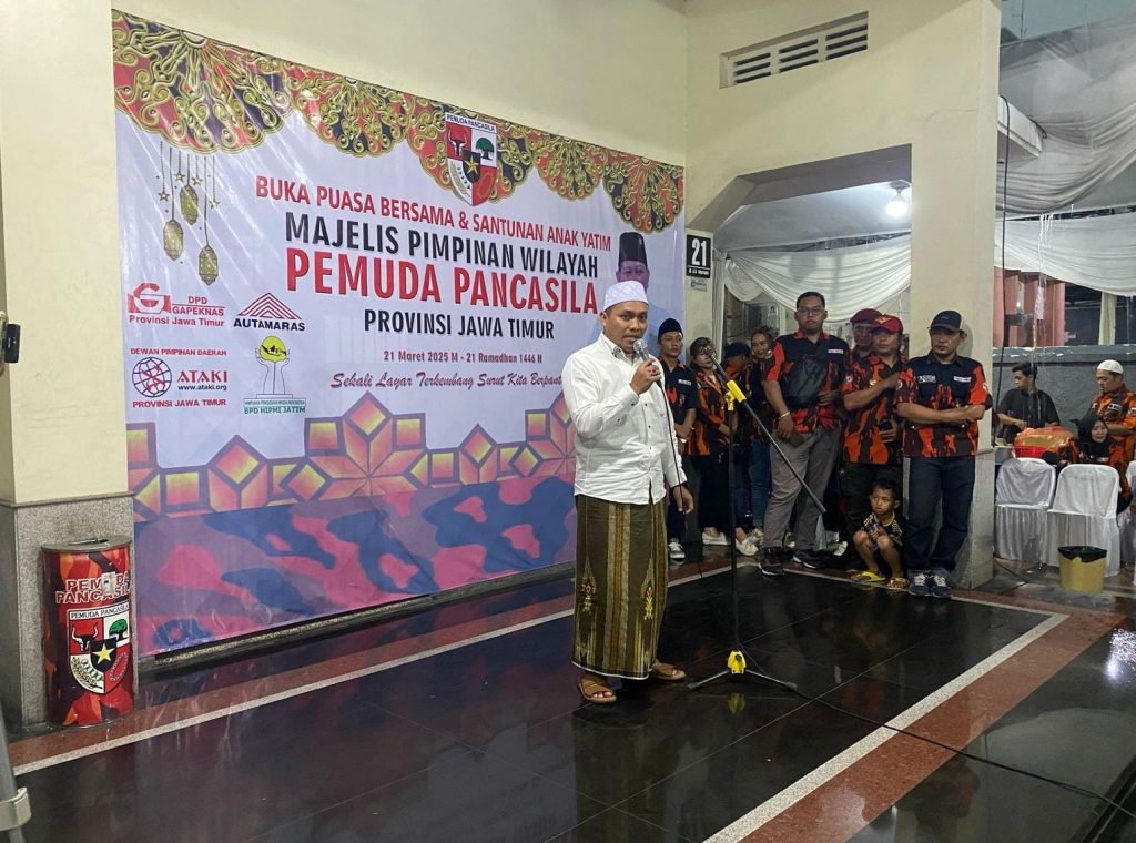 Surabaya, Pointernews.id | 22 Maret 2025 – Majelis Pimpinan Wilayah Pemuda Pancasila Provinsi Jawa Timur (MPW PP Jatim) menggelar acara rutin tahunan buka puasa bersama sekaligus santunan anak yatim, yang dilaksanakan pada hari Jum’at, (21/03/2025), pukul 15.30 WIB, di Kantor MPW Pemuda Pancasila Provinsi Jawa Timur, Jl. Jaksa Agung Suprapto No. 21, Surabaya. Acara ini dihadiri oleh berbagai elemen penting di Jawa Timur, serta berbagai tokoh penting dan berbagai organisasi yang turut mendukung kegiatan ini.