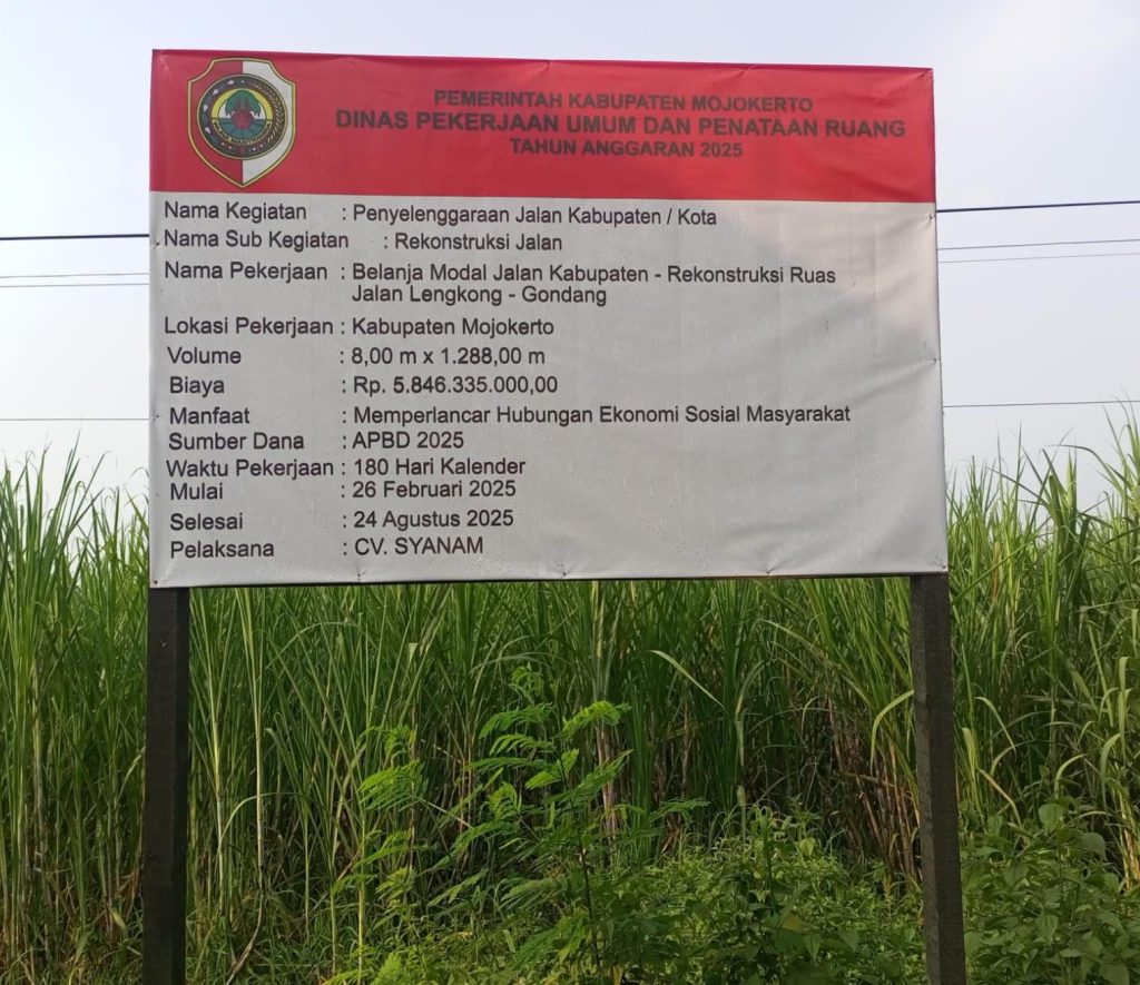 Mojokerto, Pointernews.id | 25 April 2025 – Pemerintah Kabupaten Mojokerto melalui Dinas Pekerjaan Umum dan Penataan Ruang (PUPR) tengah melaksanakan proyek rekonstruksi jalan kabupaten yang berada di ruas Lengkong-Gondang. Proyek ini merupakan bagian dari sub kegiatan penyelenggaraan jalan kabupaten/kota dengan nama pekerjaan belanja modal jalan kabupaten – rekonstruksi ruas jalan Lengkong-Gondang. Proyek ini bertujuan untuk memperlancar hubungan ekonomi dan sosial masyarakat, serta meningkatkan aksesibilitas di wilayah Kabupaten Mojokerto.