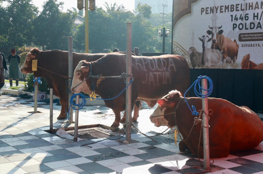 Pada puncak kegiatan yang berlangsung hari Jumat (6/6/2025), Polda Jatim sendiri menyembelih 10 ekor sapi dan 5 ekor kambing di Mapolda.