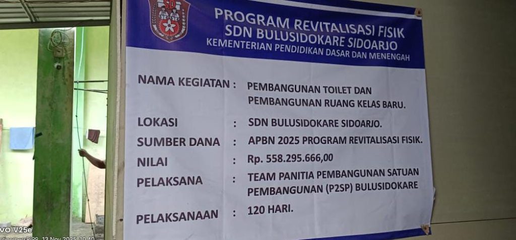 Sidoarjo, Pointernews.net | 14 November 2025 — Sebagai upaya pemerintah dalam meningkatkan kualitas sarana dan prasarana pendidikan dasar, SD Negeri Bulusidokare, Kecamatan Sidoarjo, Kabupaten Sidoarjo, kini tengah melaksanakan Program Revitalisasi Fisik Sekolah yang meliputi pembangunan toilet dan pembangunan ruang kelas baru.